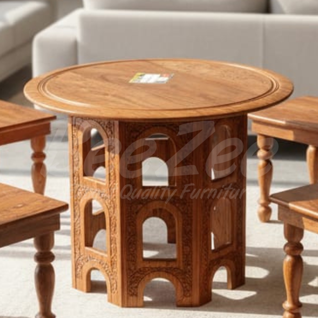 his round coffee table stands out due to its deeply carved base, inspired by traditional architectural arches. Every inch is hand-carved by skilled artisans. The solid wood top is perfect for daily use, while the base serves as a conversation starter. Finished with a natural wood stain to highlight the premium grain.