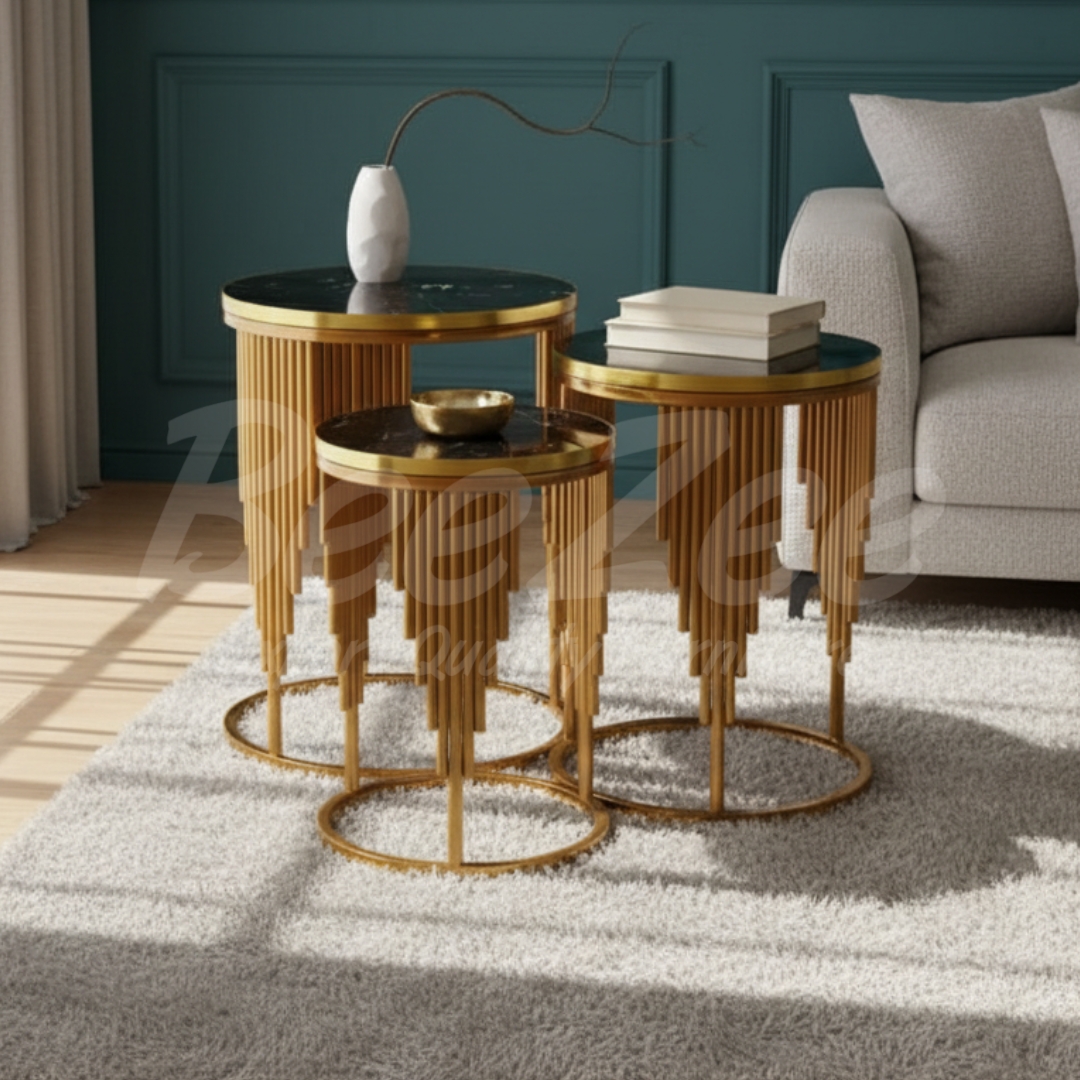 These elegant nesting tables feature a unique ribbed gold base and a sophisticated black marble top. Perfect for adding a touch of modern luxury and functional versatility to your home.